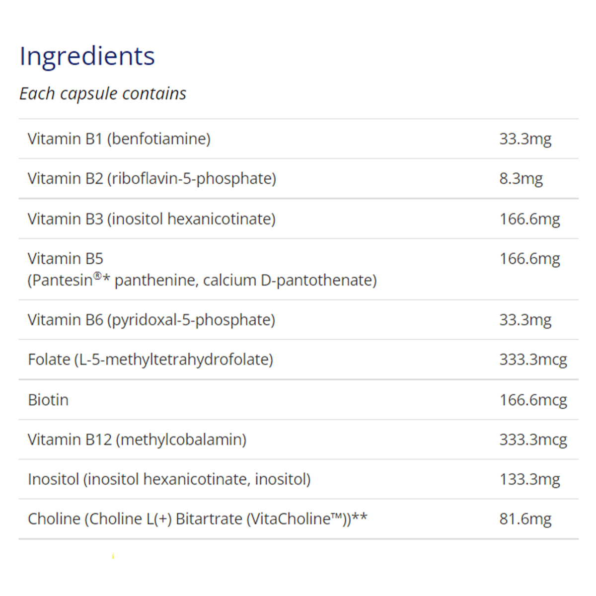 1 capsule contains: Vitamin B1 (benfotiamine) 33.3mg Vitamin B2 (riboflavin-5-phosphate) 8.3mg Vitamin B3 (inositol hexanicotinate) 166.6mg Vitamin B5 (Pantesin®* panthenine, calcium D-pantothenate) 166.6mg Vitamin B6 (pyridoxal-5-phosphate) 33.3mg Folate (L-5-methyltetrahydrofolate) 333.3mcg Biotin 166.6mcg Vitamin B12 (methylcobalamin) 333.3mcg Inositol (inositol hexanicotinate, inositol) 133.3mg Choline (Choline L(+) Bitartrate (VitaCholine ))** 81.6mg *Pantesin® is a registered trademark of Kyowa Pharma Chemical Co., Ltd. ** VitaCholine is a trademark of Balchem Corporation Vegetable-grade magnesium stearate, microcrystalline cellulose, vegetable capsule.